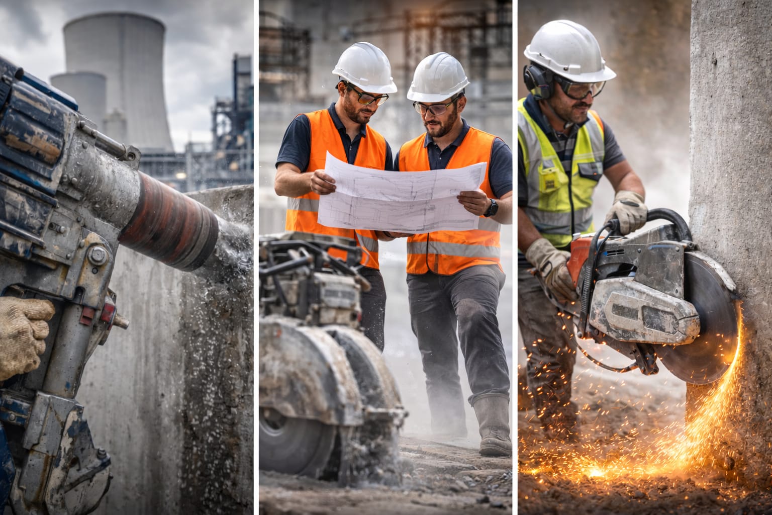 Heavy-duty reinforced concrete cutting using advanced machinery and skilled technicians.